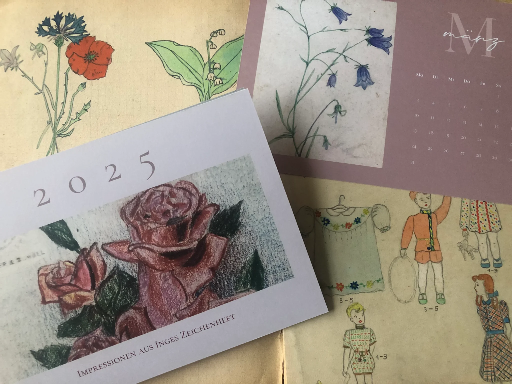Heute, 79 Jahre später, freue ich mich über meinen neuen Kalender. Die „Impressionen aus Inges Zeichenheft“ werden mich durch das Jahr 2025 begleiten und mich Monat für Monat daran erinnern, dass es nie zu spät ist, ungelebte Talente zu leben und mutig neue Wege zu gehen. Egal, wie alt wir sind. Meine Mutter hat es mir auf das Schönste vorgelebt.